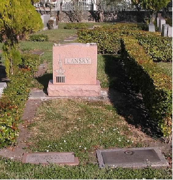 He sleeps silently in the Mt. Nebo Jewish cemetery in West Miami, Florida awaiting the coming of the Messiah. To the end, he declared himself a Jew, though not a religious one. Meyer shares his gravesite with his oldest son Buddy under the flight path of El Al jets arriving from Israel into nearby Miami International airport. A large pink colored memorial stone carved with the single un-telling name, Lanksy, and an eternal light to one side is at his head. His footstone reads modestly, "Meyer Lansky 1902 -1983", a Star of David serves as the dash between the dates. "Forever in our Hearts" is carved on the bottom row.