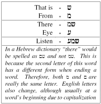 there!) The final letter of "listen" means an "eye." "Listen" is then "there-eye" in Hebrew!