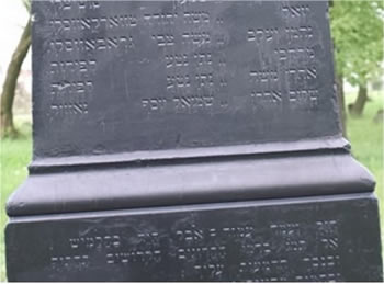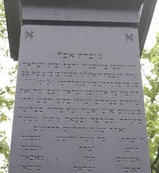 I thought that the feelings I had experienced after reading Dabe's inscription (and seeing the red blossom) would not be matched until I came to the inscriptions in Section 26, the last inscriptions to be translated in this entire cemetery. I had already encountered 35 inscriptions with phrases bespeaking violence in 26 other sections in this cemetery. But as I translated the last inscriptions from Section 26, I encountered 13 such inscriptions, one after another. Eleven remembered victims of the June 1906 Pogrom, one a woman victim of the July 1905 slaying, and the last, another woman killed in April 1907. Why were so many inscriptions placed in this section? Quite simply, because beside this section is the black pillar that remembers the Pogrom of 1906 (Image 8). The inscription at the top of the pillar's first façade reads: