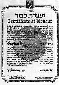 Varian Fry was posthumously honored by Yad VaShem, The Holocaust Heros and Martyrs Remembrance Authority, Jerusalem as the first American Righteous Among the Nations in a ceremony attended by Secretary of State Warren Christopher in February 1996. The additional honor of "Commemorative Citizenship of the State of Israel," awarded to selected Righteous Among the Nations "who rekindled the light of humanity during the Nazi era in Europe" was given to Fry on January 1, 1998.”( Memo to Congressmen" by Susan Morgenstein, curator of the Varian Fry special exhibit at the United States Holocaust Memorial Museum. Updated by Walter Meyerhof)