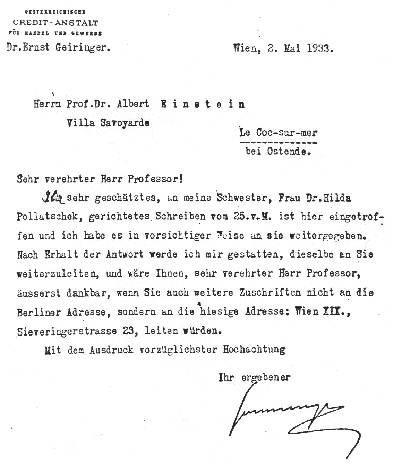 sent this letter to the Vienna address of Dr. Ernst Geiringer, Hilda's brother. On May 2, 1933, using a commercial letterhead, he