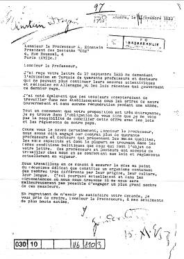 Supplement, Nov. 3, 2006, Year: 20, Number: 10240) Einstein's letter of September 17, 1933 was preceded by the July 6, 1933