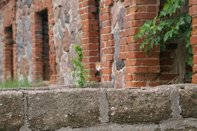 red barn cat peered out. The red of its fur nearly blended with the window's red brick