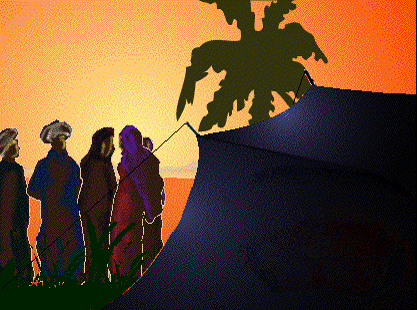 When Amathlai was three months pregnant Terah, her husband, noticed that she was very pale and that her body was growing bigger. She desperately wanted to avoid going to the special compound, so she told her husband that she was not feeling well. But Terah, a loyal subject of King Nimrod, reminded her that she must follow the king's command and report to the special compound if she was pregnant. Since he was still suspicious, he insisted on examining her, but a miracle occurred when his hands passed over her body. He did not feel anything because the embryo rose from Amathlai's womb until it lay beneath her breasts. Terah now permitted her stay at home. Inexplicably her body did not grow any bigger during the last six months of pregnancy. No one, not even her husband, became suspicious that she was pregnant. When the time came for giving birth, she disappeared from the city and wandered alone into the desert. There she found a cave where she gave birth to a son whom she names Abram. However she was very sad because she was certain that sooner or later Nimrod's agents would seize the boy and kill him. In desperation she decided to abandon her baby in the cave and leave him in God's care. Miraculously the angel Gabriel saved the baby boy.