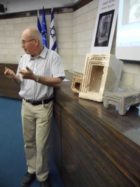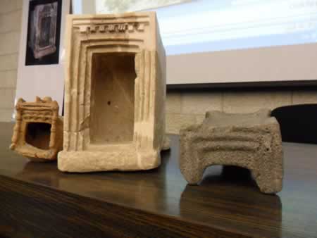 At a press conference here to mark the publication of the new book In The Footsteps of King David in the Ella Valley: Surprising Discoveries in Biblical Archaeology (Hebrew) co-authored by Garfinkle, Saar Ganor and Michael Hasel, followed by a tour of the site, Garfinkel displayed three unique artifacts discovered at Khirbet Qeiyafa. Two are small containers or shrine models, one of clay and the other chalk stone.