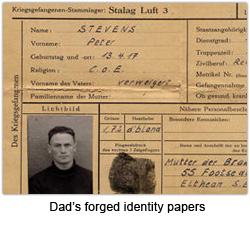 On August 7, 1941, Dad and three crewmen bombed a military target in the heavily-industrialized Ruhr valley. They were on their way back to England in the middle of the night, when they were attacked by a JU-88 German night fighter. Despite all evasive action, the two rear gunners were hit by machine gun fire, while the navigator, hit in the thigh by a 20 mm cannon shell, almost bled to death. Fortunately, one of the rear gunners reached up and grabbed the trigger of his guns, and by sheer blind luck, managed to blow the fighter out of the sky. The other gunner used the coffee from his thermos to put out a small fire, then went forward to help the navigator. Eventually, they made it back safely to England, only to realize that the plane's landing gear and flaps had been destroyed in the attack. Dad performed a flawless belly landing, and all crewmen recovered from their wounds. One of the gunners later named his only son Peter, after my father. They ran out of fuel and crash-landed near Amsterdam. A month later, on September 7, 1941, Dad and his crew were ordered to bomb Berlin, the capital of Nazi Germany and the target with the best defenses in Europe. They made it to Berlin and dropped their bombs, but the aircraft was damaged by artillery fire, and Dad ordered his crew to bail out. Both gunners did, and it was later determined that one's parachute had failed to open. Sadly, his body was never found. Dad realized that his plane was marginally flyable, and the navigator stayed with him as he turned back to England. But there was a hole in one fuel tank. They ran out of fuel and crash-landed near Amsterdam. Captured a day later, Dad and his navigator were eventually sent to separate POW camps. Of course, it was critical that the Germans never realize his true identity, as they would have immediately executed him as a traitor. For the next three years, he was without any protection whatsoever under the Geneva Convention. Daring Escapes Dad made escape his first priority, and he had a massive advantage. He was, after all, a native German. The month after his capture, in October 1941, he was sent with hundreds of other British POWs from one camp to another, locked in a cattle car with two armed Nazi guards. Using other prisoners to arrange a distraction, Dad jumped off the moving train through a ventilator shaft. Unfortunately, another prisoner had done the same thing, and was noticed by the guards. Looking out, they saw Dad running for some nearby woods, and started shooting. Fortunately he was able to make it to the forest before they perfected their aim. The guards searched the area, but did not find him. Sleeping by day and traveling by night, Dad made his way to Hanover, determined to go to his mother's house to get food, money and civilian clothing. Knocking on the door of his own home, he was told that his mother had committed suicide in July 1939, rather than submit to the Nazis. Despite the immense shock of that news, he went to see an aunt and uncle, and obtained what limited help they could offer. He headed south toward Switzerland and got as far as Frankfurt before being challenged. Not having had the opportunity to get any forged identity papers, he admitted to being an escaped British officer, and he was sent back to a POW camp. Dad disguised himself as a German guard and led prisoners out. With his German language skills, Peter Stevens became a key participant in escape schemes - either direct involvement, or helping to prepare false documents in German. On two separate occasions in December 1941, Dad disguised himself as a German guard and escorted a group of British prisoners out the camp gate. Both times they had to turn back, but a London newspaper called it "The Boldest Escape Attempt of the War." Another time, in 1943, a tunnel was built out of a camp latrine in rural Poland, and Dad managed to travel over 300 miles in 24 hours, before being captured by the Gestapo in Cologne. He spent a very unpleasant week trying to persuade them that he was not a spy, but in reality an escaped British Air Force pilot. They eventually bought his story and sent him back to another POW camp. Dad became one of only two Allied prisoners authorized by the Escape Committee to trade with the Germans at the massive Stalag Luft 3, home of the Great Escape (March 1944). Fans of the movie will recognize the James Garner character as "the Scrounger," a job filled by my father. By war's end, Dad, like all POWs, had lost over 50 pounds. But he was one of the lucky survivors, and after a horrible march westward from Poland in February-March 1945, he was liberated in April. During his captivity, he had made eight escape attempts, and actually got outside the wire fencing three times. Today, he is mentioned in numerous books, on record as one of World War II's greatest escape artists. In 1946, he was awarded Britain's Military Cross for extreme bravery. He then served five years in MI6, the British secret intelligence service, spying against the Soviets at the height of the Cold War. In 1952, Dad immigrated to Canada and became a businessman. Secrets Revealed