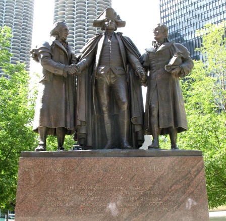 Haym Salomon, George Washington, Robert Morris The Great Triumvirate of Patriots Monument, designed by Lorado Taft, stands, prominently sited today on Wacker Drive in Chicago. Haym Salomon stands on the right of Washington, Morris on his left. Inscribed on the front of the monument is Washington’s address to the Jewish congregation in Newport, R.I. “ The Government of the United States which gives to bigotry no sanction, to persecution no assistance, requires only that they who live under its protection should demean themselves as good citizens in giving it on all occasions their effectual support.” On the back of the monument is an image of the Goddess of Liberty holding her torch with arms extended over the multi-ethnic, peoples of America. Poignantly, the monument originally intended for Haym Salomon, became the metaphor for the United States. The monument was dedicated December 15, 1941, one week after the Japanese attack on the American naval base in Pearl Harbor, Hawaii that brought America into World War II. The Chicago monument that, included Salomon, was not to be the only monument in his honor. January 7, 1944, a monument to Haym Salomon alone was dedicated in Los Angeles. By then, dedication of a monument to honor Salomon hardly raised a ripple of opposition. During WWII a liberty ship was named the Haym Salomon. Numerous books were written about Salomon since the 1930’s, some popular culture, few of deep scholarship, almost all reflecting the mythologized Salomon. Many were geared to Jewish youth to give them pride and roots in the American story.