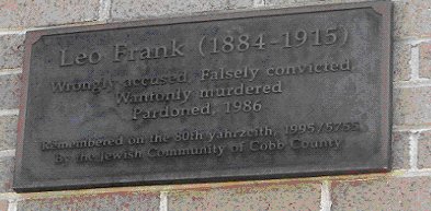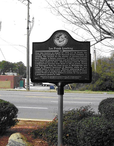 Marker at Lynching Site The text of the marker reads: "Near this location on August 17, 1915, Leo M. Frank, the Jewish superintendent of the National Pencil Company, in Atlanta, was lynched for the murder of thirteen year old Mary Phagan, a factory employee. A highly controversial trial fueled by societal tensions and anti-Semitism resulted in a guilty verdict in 1913. After Governor John M. Slaton commuted his sentence from death to life in prison, Frank was kidnapped from the state prison at Milledgeville and taken to Phagan's hometown of Marietta where he was hanged before a local crowd. Without addressing guilt or innocence and recognition of the state's failure to protect Frank or bring his killers to justice he was granted a posthumous pardon in 1986.