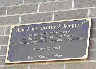 Rabbi Stephen Lebow of Temple Kol Emeth in Marietta, Georgia began a vigil at the site of the Leo Frank lynching in 1995. He has fought for justice for Leo Frank for twenty years. Lebow worked with the owner of the Frank lynching site to place two small memorial markers on the small office building that had been erected there. It was a focal point for an annual memorial service that he and members of the community observed. Beginning in 2004, the Jewish American Society for Historic Preservation began an effort to properly mark the site of the Leo Frank lynching historically. It became very important to do so because the building where Rabbi Lebow had placed his small memorial markers was going to be torn down to make room for a highway off ramp. The historical integrity and the historicity of the site of the Leo Frank lynching was going to be lost forever. JASHP had learned, under Georgia law, if a site of significant historical importance is marked with a Georgia Historical Society (GHS) interpretive maker, the historicity of the site must be preserved. Eminent domain cannot be overcome even for history but what JASHP realized was if a GHS marker is located at the lynching site, and the site is redeveloped, the marker must be replaced appropriately, nearby, once construction is completed. In other words, if a GHS marker is erected for Leo Frank, the marker must be put back and the meaning and significance of the site will be preserved for future generations. A four year effort ensued, led by JASHP, and culminated in 2008. In a dedication program sponsored by the Anti-Defamation League, attended by former Georgia Governor Roy Barnes, Rabbi Lebow of Kol Emeth, Jerry Klinger of JASHP, Georgians, Jews and non-Jews, including family descendents of the onetime lynch mob, and political leaders, a Georgia Historical Society interpretive marker was placed at the lynching site. [7] [8]