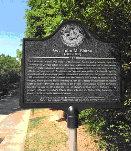 Governor Slaton historic marker 2013, JASHP began an interchange with the Georgia Historical Society to see about placing a Georgia Historical Society marker honoring Governor John Slaton. With the Jewish American Society for Historic Preservation as the lead, support for the effort was enlisted from the Atlanta History Center, Mr. Frank Walsh of Atlanta became a key connection and supporter, Rabbi Stephen Lebow, the Anti-Defamation League, the Georgia Historical Society, Georgia Government officials, Georgians, both Jewish and non-Jewish, members of the Georgia Judiciary, including the Georgia Supreme Court, and members of Governor Slaton's family came together, June 17, 2015. For the first time in Georgia History, Governor John M. Slaton was honored. The text of the marker reads: "Gov. John M. Slaton (1866-1955) John Marshall Slaton was born in Meriwether County and graduated from the University of Georgia before practicing law in Atlanta. Slaton served in both houses of the Georgia legislature and two terms as governor (1911-1912 and 1913-1915). While in office, he modernized Georgia's tax system and roads. Concerned by the sensationalized atmosphere and circumstantial evidence that led to the notorious 1913 conviction of Jewish businessman Leo Frank in the murder of teenager Mary Phagan, Slaton granted Frank clemency in June 1915. Slaton's commutation of Frank's death sentence drew national attention but hostile local backlash resulted in Frank's lynching in August 1915 and the end of Slaton's political career. Slaton lived on property adjacent to today's Atlanta History Center and Slaton Drive (named in his honor). He is buried in Oakland Cemetery. Erected by the Georgia Historical Society, Jewish American Society for Historic Preservation, and the Atlanta History Center." Letters of support for the Governor Slaton project were solicited by JASHP and presented by Jerry Klinger at the dedication. Letters of support came from Georgia Governor Nathan Deal[9], U.S. Senator David Perdue[10], U.S. Senator Johnny Isakson[11] and Congressman John Lewis[12] Georgia Supreme Court Justice David Nahmias spoke at the dedication of the Slaton marker: "In the final blot that the case placed on the history of our state, a mob kidnapped Leo Frank, drove him to Marietta, and lynched him. It is altogether right that we still celebrate what Governor Slaton did, because we need to remember those who stood tall in defense of the rule of law, to inspire all of us who need to stand tall when the rule of law is again threatened, as it is in one way or another almost every day. We need to fight for equal justice under the law, even if we do not immediately prevail. Governor Slaton is and should be a particular inspiration to people like me - judges on the courts of Georgia and on the federal courts - the kind of judges who were unable to protect Leo Frank from the unjust ending that the mob demanded. " From the speech of Jerry Klinger at the Slaton marker dedication: 'The words carved into Leo Frank's footstone still ring in people's ears. Semper Idem, Always the same for the Jew. The words have truth in Europe and around the world as anti-Semitism grows in the guise of being anti-Israel. As it was in 1915, the words Semper Idem do not have to mean, always the same, in a negative sense. It must be remembered, it must be acknowledged, that people like Governor John Slaton do exist. There were brave people who were willing to face the mob and racial hatred in 1915. Today, some only see darkness for the Jew, even in America. They should know they are wrong. Semper Idem, there are always people, brave people, people whose hearts are not filled with hate, who are willing to risk it all for justice, toleration and the freedoms that Americans so deeply cherish for a better tomorrow." Jerry Klinger is president of the Jewish American Society for Historic Preservation. [1] Latin - Always the Same [2] https://www.youtube.com/watch?v=8sZLBpwviIk [3] http://www.the-temple.org/ [4] http://the-temple.org/AboutUs/History/RabbiDavidMarx.aspx http://law2.umkc.edu/faculty/projects/ftrials/frank/frankclemency.html[5] By Abhijitsathe (Own work) [CC BY 3.0 (http://creativecommons.org/licenses/by/3.0)], via Wikimedia Commons[6] [7] http://www.jewish-american-society-for-historic-preservation.org/leofrank.html [8] The marker has been temporarily relocated to the Breman Museum in Atlanta for safe keeping until construction of the off ramp is completed. The marker will be appropriately placed near the original site at that time. [9] To: The attendees of the Governor John Slaton Historical Marker Dedication Ceremony Greetings: I am pleased to extend my warmest regards to the Georgia Historical Society, the Atlanta History Center, and the Jewish American Society for Historic Preservation as you host the dedication ceremony for Governor John Slaton's historical marker. On behalf of the State of Georgia, it is a pleasure to be part of this historically signify cant event recognizing the late Governor Slaton. Please allow me to welcome today's distinguished guests, relatives of Govern Slaton, and other attendees. Governor Slaton played a vital role in the State of Georgia, first as a member of the Georgia General Assembly and later as the state's 60th governor. He demonstrated a continued commitment to the wellbeing of our state, nation, and his fellow citizens. I applaud those attending today's reception for being a part of this event which celebrates his exceptional life of service and acknowledges his countless contributions to our great state. It is my hope that the memorialization of this marker will afford future generations the opportunity to now of and appreciate govern Slaton and his place in Georgia's history. I commend the various groups and individuals who had a hand in organizing this important event. Sandra and I send our best wishes for a successful and memorable ceremony. Sincerely, Nathan Deal [10] Mr. Jerry Klinger Pres