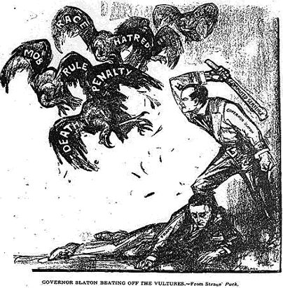 Gov. Slaton beating off the vultures The world had its eyes on Georgia. The world had its eyes on Governor Slaton and so did Americans nationwide. An estimated 100,000 letters poured into the Governor's office demanding that Slaton commute Leo Frank's sentence. With only weeks left in office, Slaton undertook the gargantuan task of reviewing in depth and detail the case of Leo Frank. Slaton laboriously reviewed over 10,000 pages of testimony. He reviewed the events of the trial and the people involved in it. He personally went to the National Pencil Factory to see for himself where the murder was alleged to have occurred and where Mary's body was found. He reviewed studies of the "murder notes" and personally made a shocking discovery about the evidence and course of the trial. The veracity of the prosecution's key witness was essential for the conviction of Leo Frank. Jim Conley had to be absolutely telling the truth about the events that April day in order for Frank to be guilty without even the vaguest shadow of a doubt. Governor Slaton went to the National Pencil Factory and visited the second floor office and work shop area that the murder was alleged to have been committed in. He then took the elevator to the basement as Conley had said he used the elevator to transport the body to the basement. Conley also testified he used the elevator's landing area as the place he preferred to relieve his bowels. He testified, he defecated at the bottom of the elevator shaft the morning of the murder before he and Frank brought Mary's body down to be burned in the incinerator. The police investigation of the crime scene did not include using the elevator at first. The police used the ladder that connected the basement to the first floor. They did note the uncrushed, fresh human excrement on the bottom of the shaft where the elevator would have normally stopped. Later, the police did use the elevator to descend to the basement. The elevator landed with a jarring thud. The smell of freshly crushed human excrement filled their nostrils. The elevator's braking system was poor. It only stopped, every time it was used, when the elevator hit the bottom of the shaft with a jarring thud, crushing into the floor. It was evident that Conley's testimony of having used the elevator with Frank to transport Mary's body to the basement was a lie. Conley's own excrement would have been crushed if he had. Strangely, Frank's defense team did not pick up on this key piece of evidence which notoriously became known as the Shit in the Shaft defense. It was not the first lie that Conley had been caught in. The Shit in the Shaft defense, if it had been focused on by Frank's lawyer, would have been pivotal in discrediting Conley's testimony. Frank's attorney never did use it. Governor Slaton rode the elevator. He experienced the jarring thud of the elevator crushing into the floor to stop. He took his legal obligation to consider the evidence, the trial and the appeal to the Chief Executive Officer of the State of Georgia, very seriously. He clearly understood the "buck stops with him", as President Harry Truman phrased things. The taking of a human life by the State of Georgia was a matter that needed the utmost scrutiny and review. Slaton grew increasingly uneasy with the absolutely guilty verdict of the jury as his investigations continued. With five days left in his term as Governor, with protests and vigils against commutation, Slaton made up his mind. He told his wife Sally his decision late at night before he released it to the public. He told her it could mean the end of his political career. It could mean his life was in danger. She held him tightly and said, she preferred to be the widow of a brave man than the wife of a coward. Governor John Marshall Slaton's commutation was released in the morning.[5] It was 10,000 words long, 29 pages. In detail, the Governor explained his reasons for commuting Leo Frank's death sentence to life imprisonment. Slaton wrote he did not disagree with the verdict of the court that Frank was guilty but he was not absolutely certain. His uncertainty came from a series of problems. "In the Frank case three matters have developed since the trial which did not come before the jury, to wit: the Carter notes, the testimony of Becker, indicating that the death notes were written in the basement, and the testimony of Dr. Harris, that he was under the impression that the hair on the lathe was not that of Mary Phagan, and thus tending to show that the crime was not committed on the floor of Frank's office." He reserved special condemnation for what he recognized as Jim Conley's false testimony. The Governor's written decision continued: ".The evidence might not have changed the verdict, but it might have caused the jury to render a verdict with the recommendation of mercy. In any event, the performance of my duty under the Constitution is a matter of conscience. The responsibility rests where the power is reposed. Judge Roan, with that awful sense of responsibility, which probably came over him as he thought of that Judge before whom he would shortly appear, calls to me from another world to request that I do that which he should have done. I can endure misconstruction, abuse and condemnation, but I cannot stand the constant companionship of an accusing conscience, which would remind me in every thought that I, as Governor of Georgia, failed to do what I thought to be right. There is a territory "beyond a Reasonable doubt and absolute certainty", for which the law provides in allowing life imprisonment instead of execution. This case has been marked by doubt. The trial judge doubted. Two Judges of the Supreme Court of Georgia doubted. Two Judges of the Supreme Court of the United States doubted. One of the three Prison commissioners doubted. In my judgment, by granting a commutation in this case, I am sustaining the jury, the judge, and the appellate tribunals, and at the same time am dis