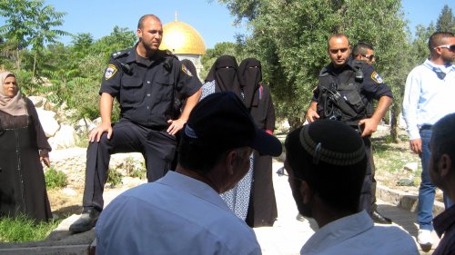 Police separating Jewish visitors from protesting Arab women who are paid by a Muslim organization to disturb the visit of every Jewish group.